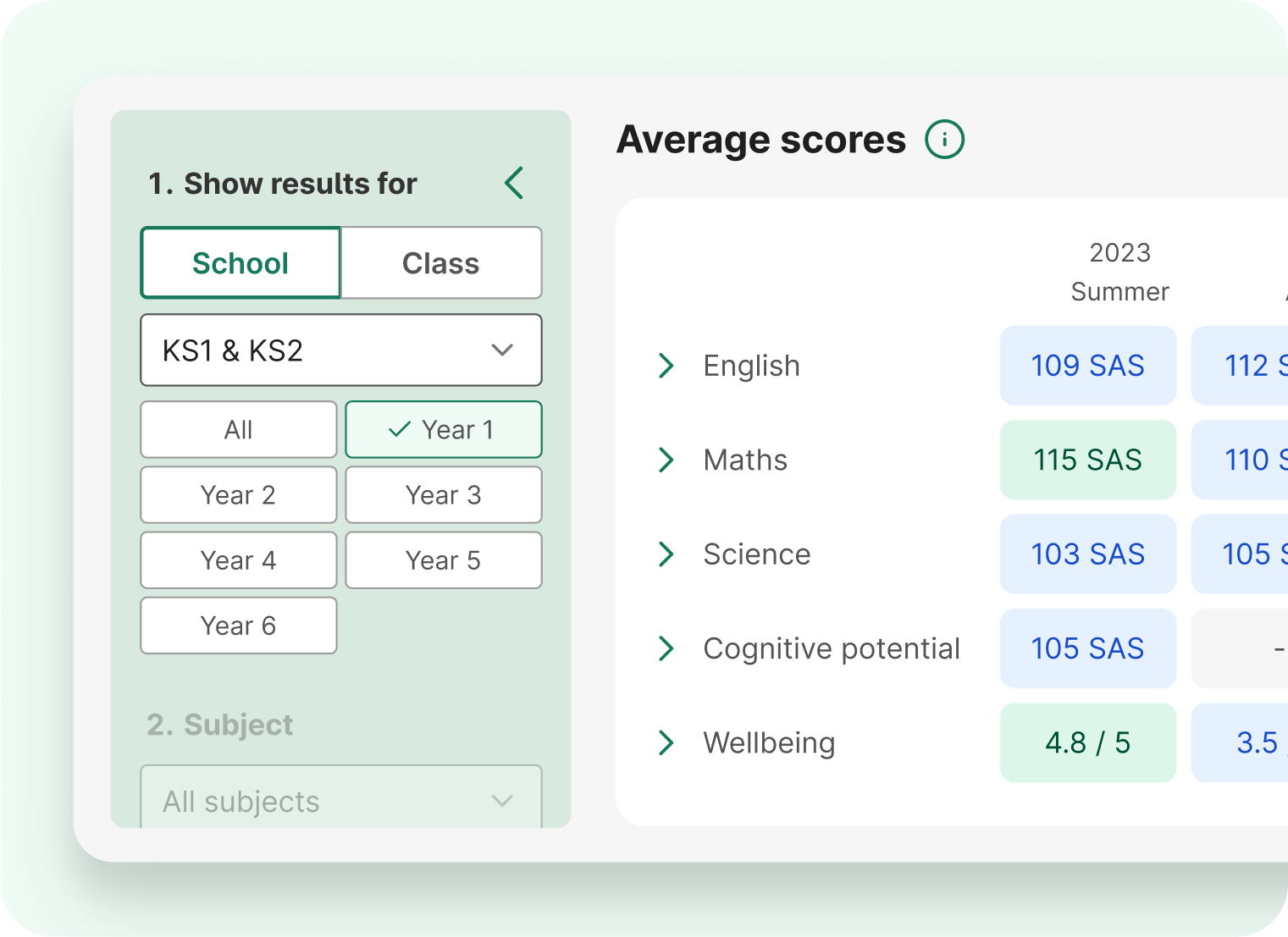 Analyse performance by year group to celebrate successes and target improvement efforts where they’ll have the most impact. Compare year-on-year data to track progress and identify patterns.