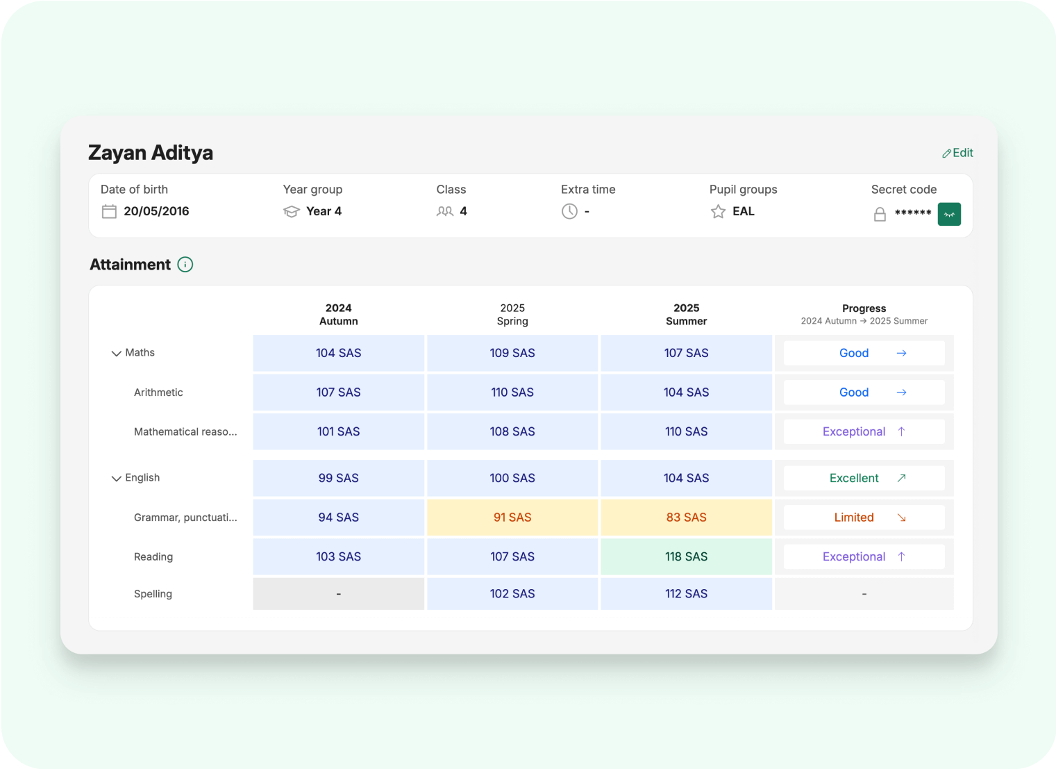 Compare results over time to see how pupils are developing. Celebrate progress, spot issues early, and have inspection-ready evidence whenever you need it.